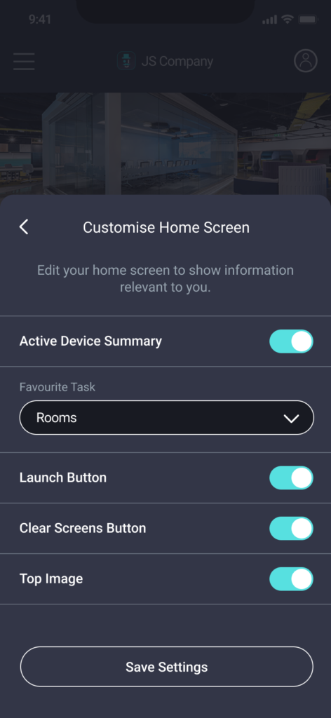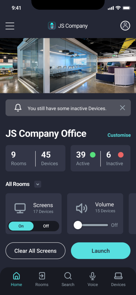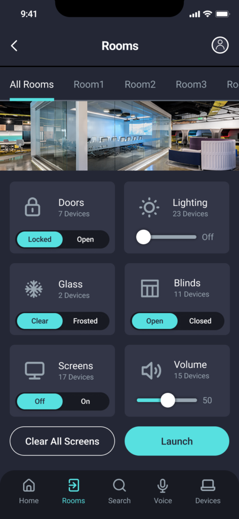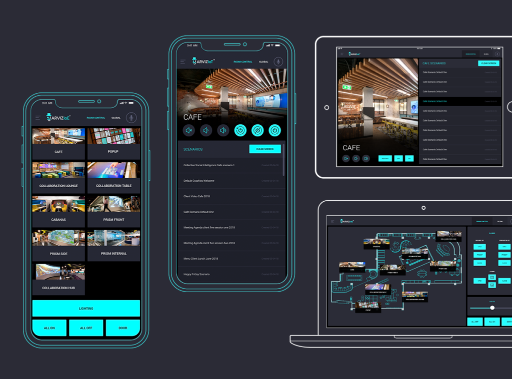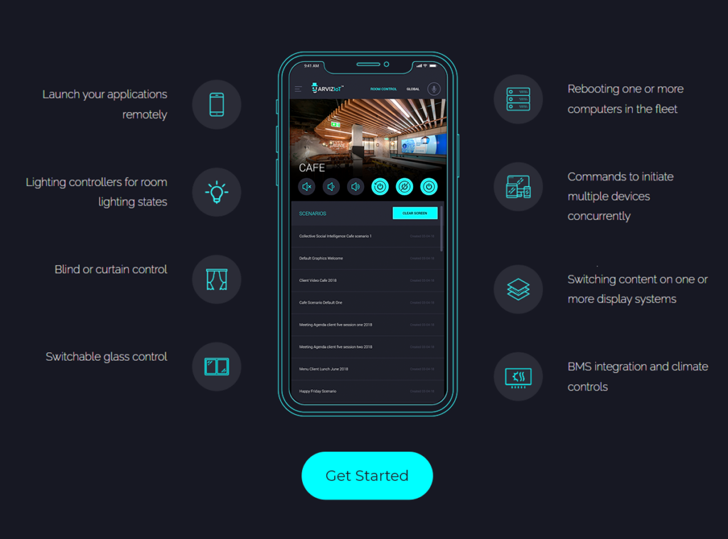 Jarviz-IoE (Internet of Everything) is a universal room control app developed by Get-CSI, designed to allow users to control everything in a room, floor, or building—from lights and blinds to frosted glass, displays, PCs, and even bespoke programs. It integrates closely with Get-CSI’s backend platform, the Jarviz-IoE Launcher, which sends content and device instructions directly to the app.