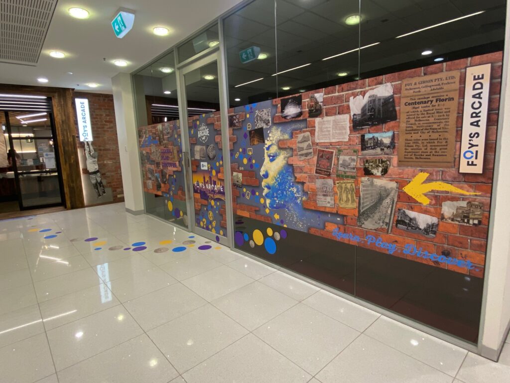 Adjacent to Foy’s Arcade in Melbourne (My workplace at the time) a neighbouring tenancy was vacant. The client was looking to simultaneously cover the glass windows of the vacant space, and act as wayfinding for our workplace, where customers could learn more about the history of the building and the story behind the arcade.